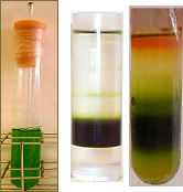 Tubes with Synechocystis cell culture. Left: intact cells. Center: Membrane fraction of Synechocystis is isolated from other parts of the cell and concentrated. Right: Plasma (top of the tube) and thylakoid (mid-bottom of the tube) membranes are isolated and concentrated.